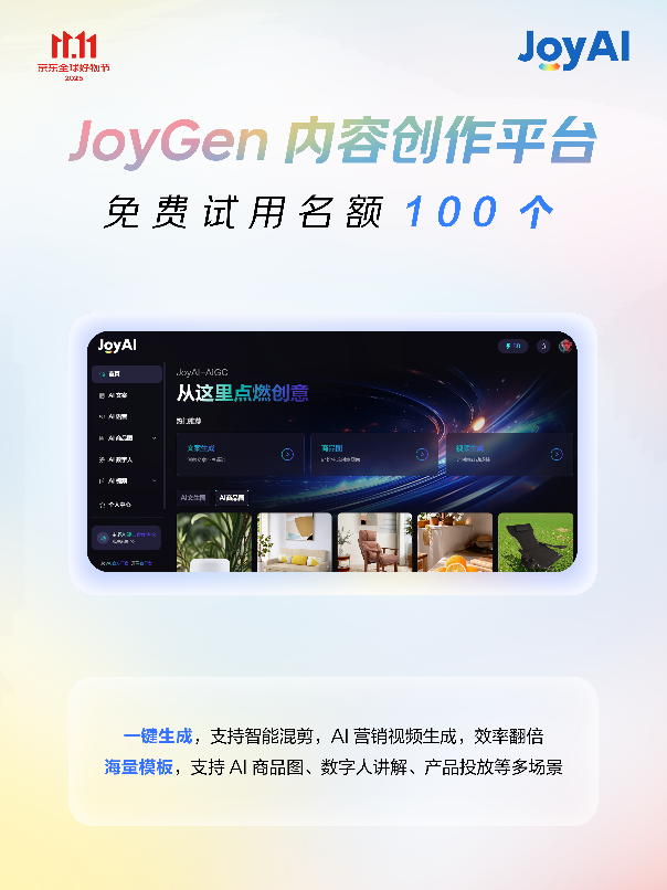 JoyGen内容创做平台供给100个免费账号,效率提拔显著。JoyGen平台还供给海量模板库,京小智5.0商家办事智能体全面免费试用,可按照用户浏览行为保举商品,接入京小智5.0的商家,为商家供给超万万免费资本取超50款专业AI东西,京东携JoyAI全线产物,并推出多个焦点产物优惠政策?