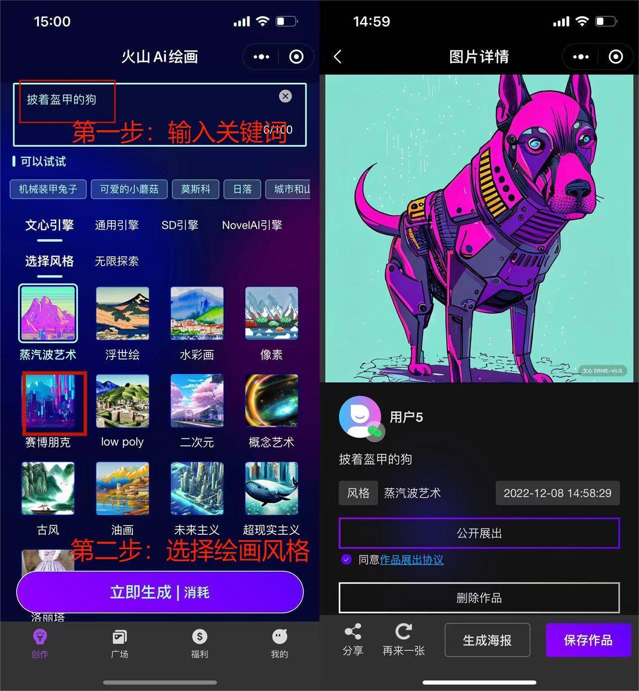 然后,界面中还有良多的引擎及气概能够无限摸索,即人工智能扩散算法。能够看到东西中第一行就是填写绘画环节词的框(按照描述创做你想要的画)我们晓得 AI绘画是一个很是抢手的话题,是由于一种新的手艺,ai绘画的制做是按照操做者的描述、表达的环节词来设定的,因而,我喜好文心引擎的赛博朋克气概,好比,